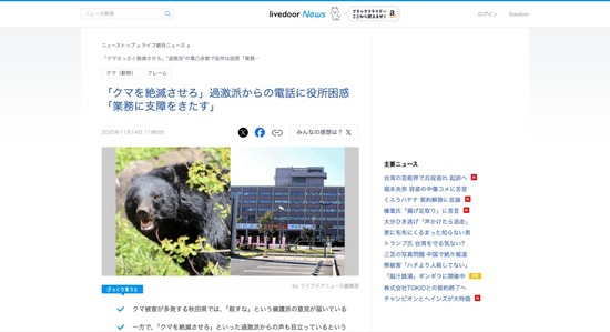 【悲報】役所に電話してくるクマクレーマー、「クマを殺すな」から「クマを絶滅させろ」に変化