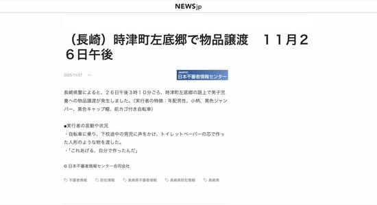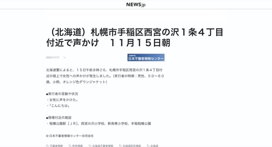 【札幌】朝の8時に「こんにちは」と女性に挨拶した男、通報される