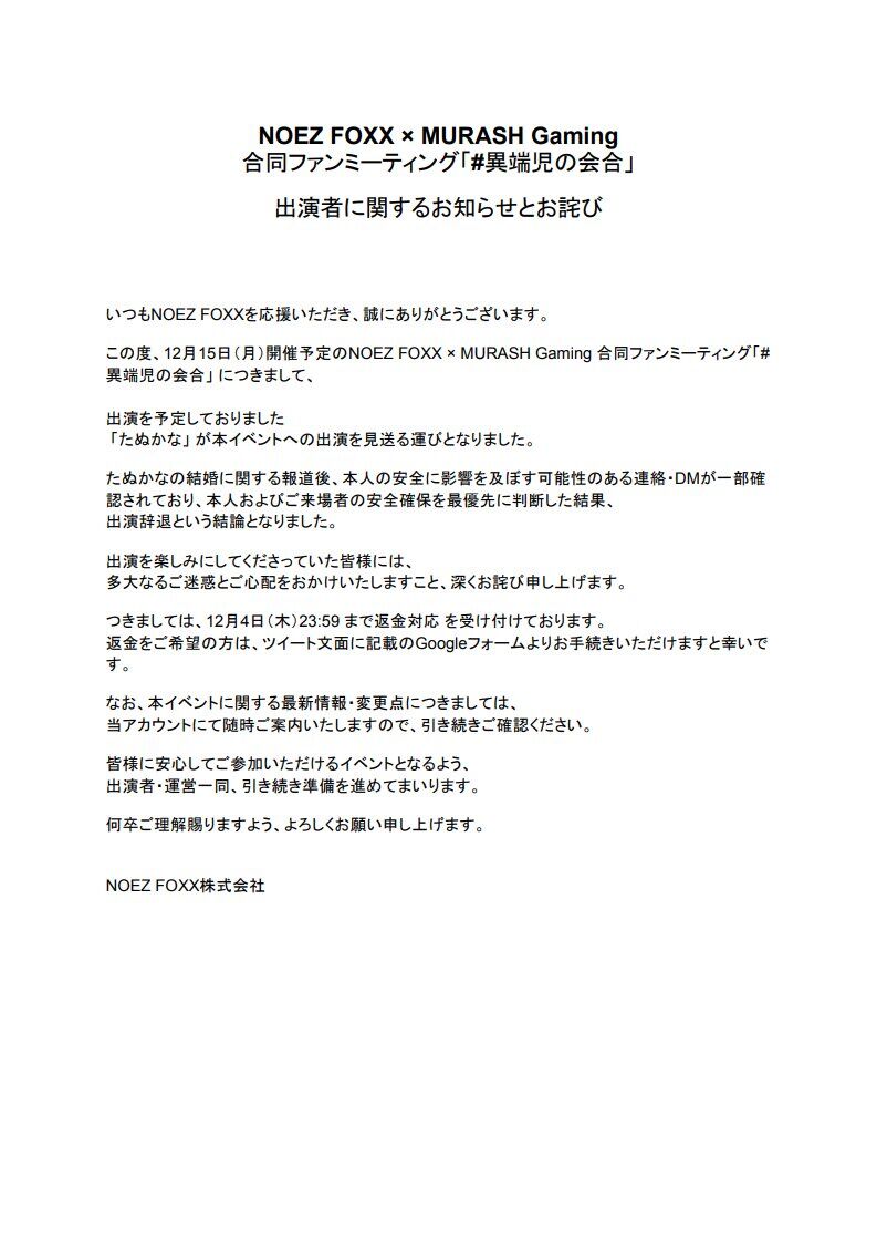 たぬかなさん、身の安全が確保されない為にイベント出演自粛へ
