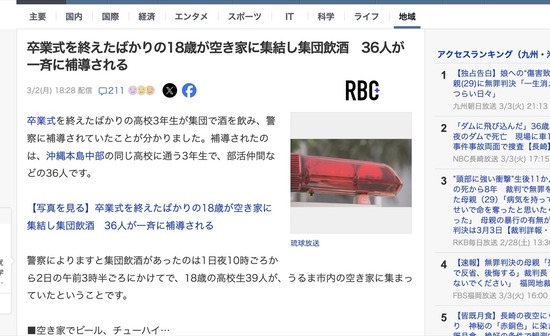 高校生が卒業式後に39人で空き家で飲酒 36人補導