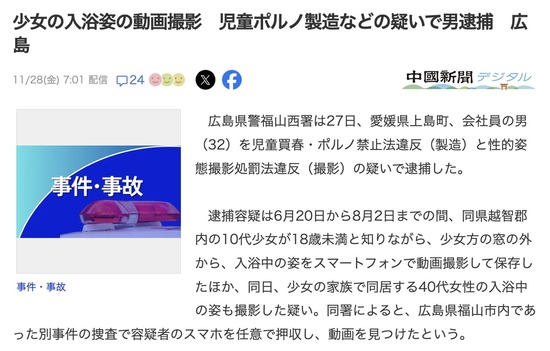 女児の入浴をスマホで盗撮、ついでにその母親も盗撮した男を逮捕