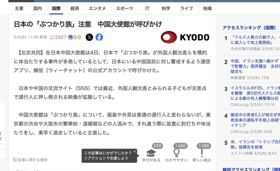 在日本中国大使館「日本で『ぶつかり族』が多発してるから人民は訪日を控えろ」