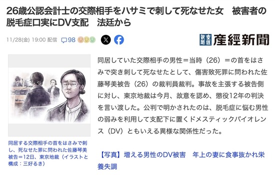 交際相手をハサミで刺して殺害した女「ハゲすぎる。やっぱり毛がある人がいい」