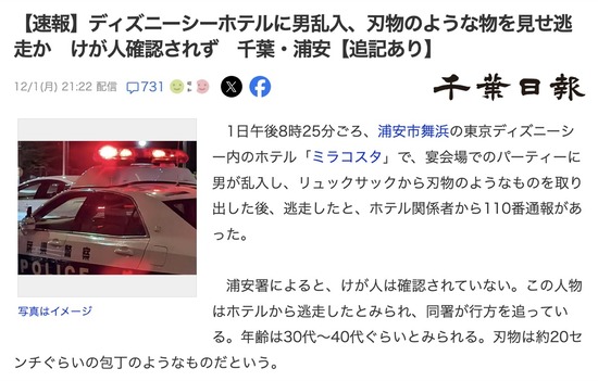 【千葉】東京ディズニーシーホテル「ミラコスタ」でのパーティーに男乱入、刃物のような物を見せ逃走