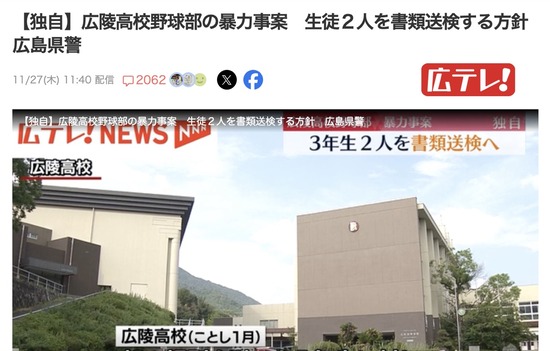 【広島】広陵高校野球部の暴力事案 生徒2人を書類送検へ