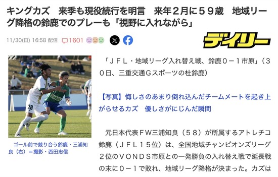 【朗報】三浦知良さん(58)、来季も現役続行へ
