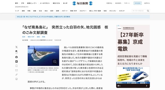 【悲報】毎日新聞「地元住民、南鳥島の核ごみ文献調査に困惑」←誰も住んでないし一番近い島からも1200km