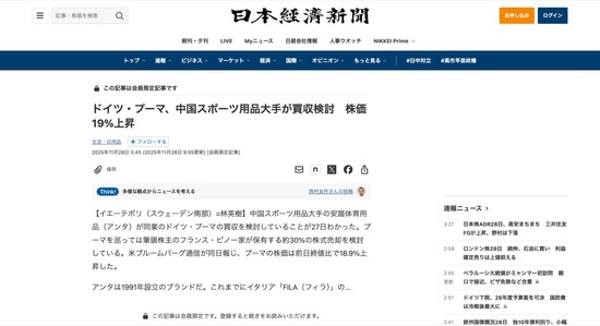 中国スポーツ用品大手、プーマの買収検討