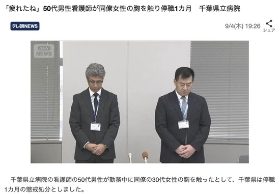 【千葉】「疲れたね。もう胸をもませてよ」50代男性看護師が同僚の30代女性の胸を触り停職1カ月