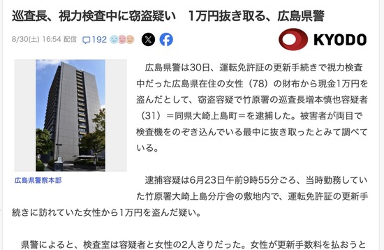 広島県警の巡査長(31)、視力検査中の女性から現金1万円を盗む