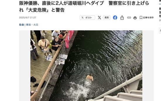 【野球】阪神優勝、道頓堀川へのダイブが発生