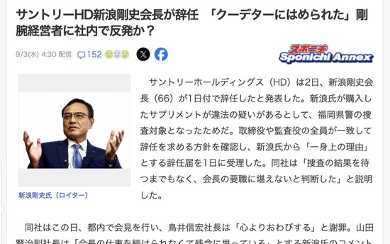 違法薬物疑惑で辞任したサントリー新浪前会長「クーデターにはめられた」