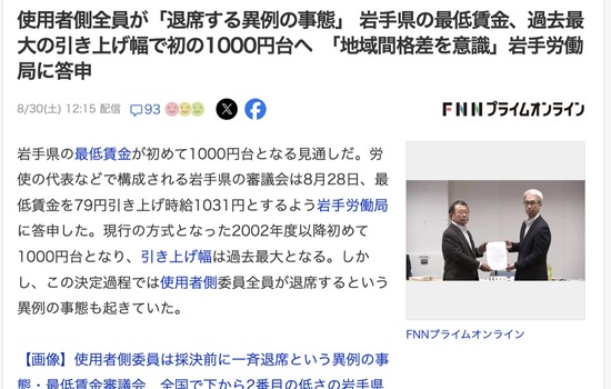 【悲報】岩手の最低賃金を決める話し合い、経営者全員がブチ切れて退席ww