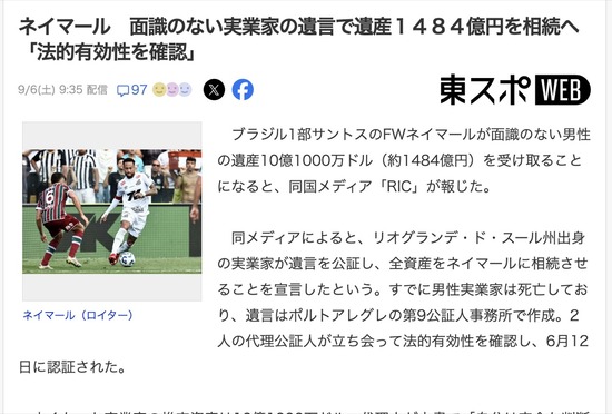 【サッカー】ネイマールさん、面識のない実業家の遺言で遺産1484億円を相続へ「法的有効性を確認」