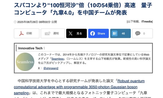 中国の研究チーム、スパコンより100恒河沙倍(10の54乗倍)高速 量子コンピュータ「九章4.0」を発表
