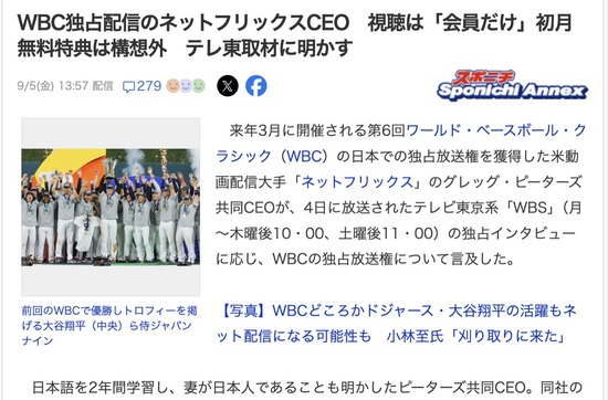 【悲報】NetflixのCEO「WBC配信は会員だけ」「初月無料はやらない」