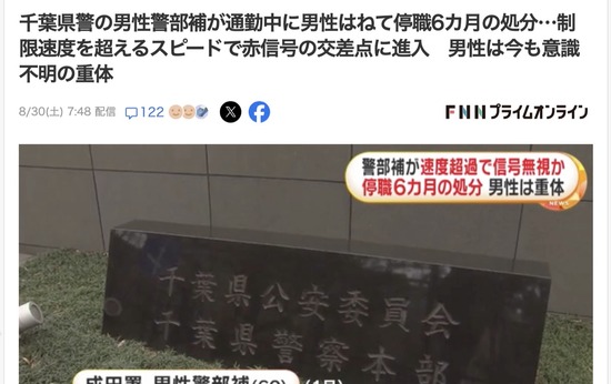 【千葉県警】速度超過で信号無視、男性をはねて意識不明にした警部補に停職6カ月