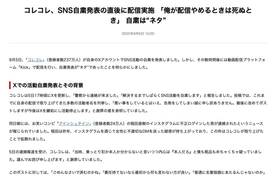 暴露系配信者のコレコレ、アインシュタイン稲田が無実だったので活動停止を発表「警察から連絡が来ました」