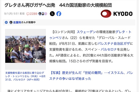 環境少女グレタ、44ヶ国連合船団70隻を引き連れてガザ地区へ出撃