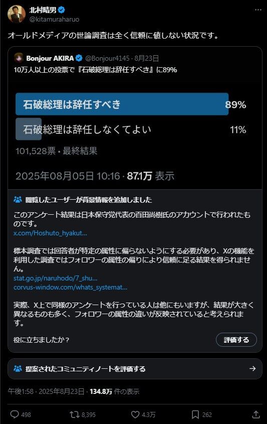 北村弁護士「Xでは89%の人達が石破辞任を求めてる。オールドメディアが嘘ついてるの分かりますね」