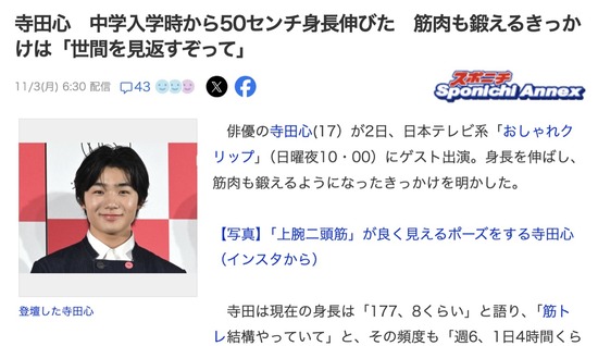 【悲報】寺田心さん、身長178cm