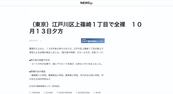 【江戸川区】首からプラカードをぶら下げてコートを着た全裸が発生