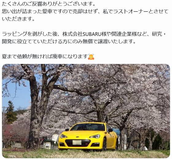サイ速02/15 21:38 【悲報】スバリストさん「46万キロ走行したBRZを廃車にします…」→賞賛→「メーカーの研究用としてなら無償で譲渡します」→「ただの過走行車だろ」「そんな価値はない」「キモい」