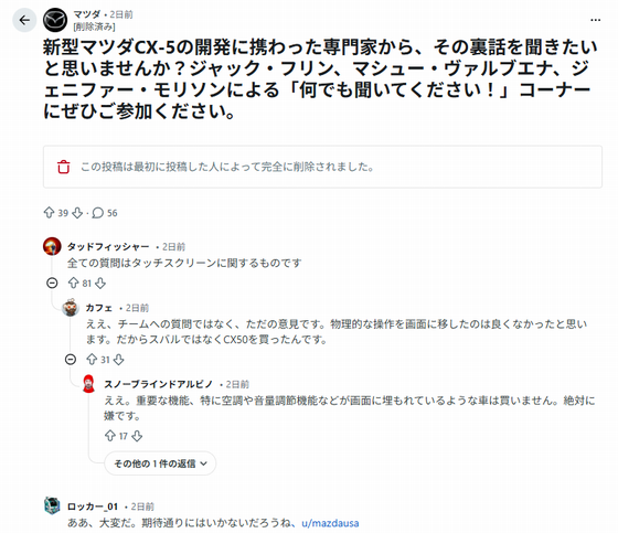 サイ速02/21 21:38 【悲報】マツダ関係者が新型CX-5に関する質問を米掲示板Redditで募集→タッチスクリーン導入による物理ボタン廃止への批判殺到し削除→公式が再投稿→質問が大人しくなり怪しまれる