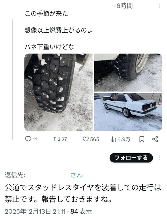 【悲報】「公道でスタッドレスタイヤを装着した状態での走行は禁止です」と言われ通報されたタイヤがこちらwww