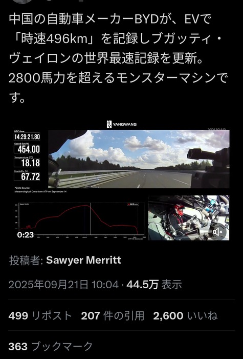 ガソリン車終わる…BYD「ヤンワン U9」、時速496kmを記録し世界最速の市販車になってしまうwwwwwwwwwww