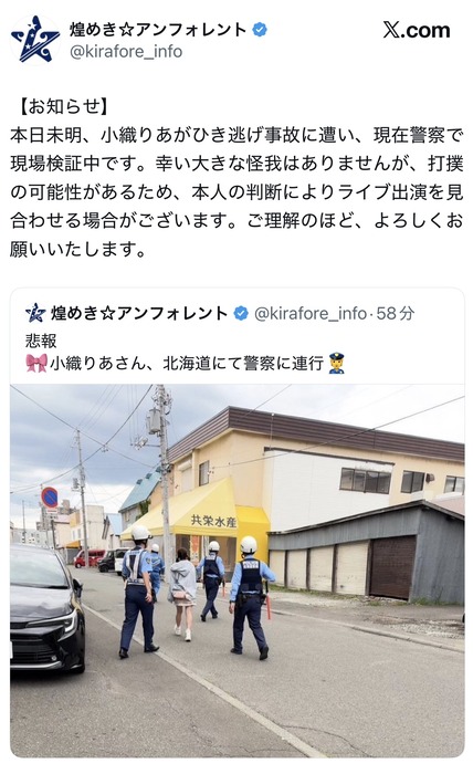 【悲報】アイドル公式アカウントさん、メンバーがひき逃げ事故に遭っているのにふざけた投稿をしてしまうwwwwwww