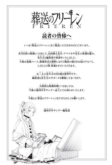ポンポコにゅーす - ファン特化型アニメ感想サイト10/17 04:05 「葬送のフリーレン」正式に休載を発表、期間は“しばらく”とのこと。今後は連載ペースや掲載形式を調整しながら物語の続きをお届け……みんなで待とう!!(コメント追記)
