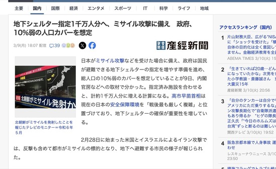 【防衛】政府、1000万人分の地下シェルターを確保へ