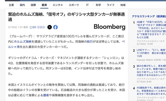ホルムズ海峡チャレンジ、「位置情報信号オフ」でギリシャ大型タンカーが通過に成功