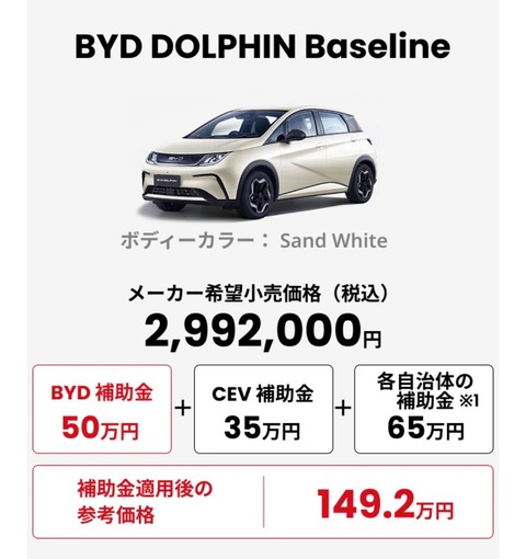 【何が起きてるの?】BYDさん、値引きがエグすぎる…「BYD補助金」と銘打って最大117万円の値引きを実施→中古車より新車が安くなってしまうwwwwwwwwww