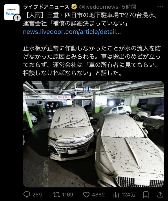 【画像】水没地下駐車場、補償地獄へwwwwwwwwwwwwwwwwwwww