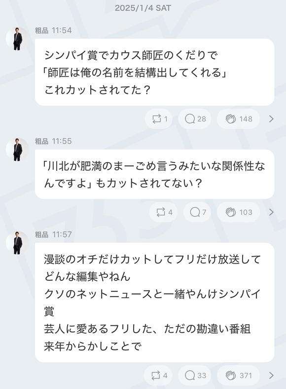 【速報】霜降り粗品さん、一昨日放送されたシンパイ賞にブチギレ中「来年は出ない」