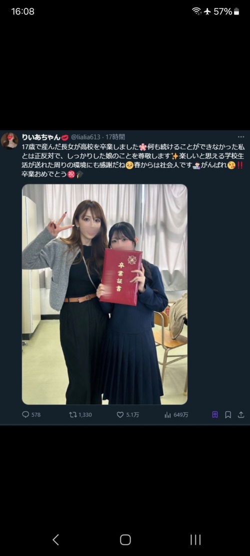 【画像】美人母「17歳で産んだ子供が高校卒業した///」パシャッ ←600万いいね