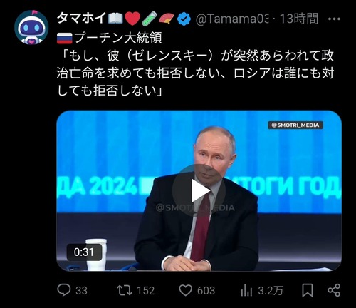 【あっ】プーチン「もしゼレンスキーが亡命を求めてきても拒否しない」