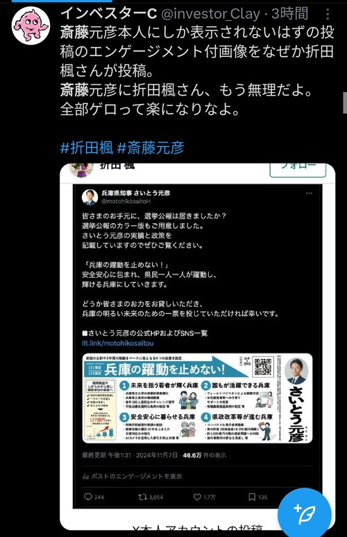 【悲報】楓ちゃん、何故か斎藤元彦のTwitter垢にログイン出来ていた😭