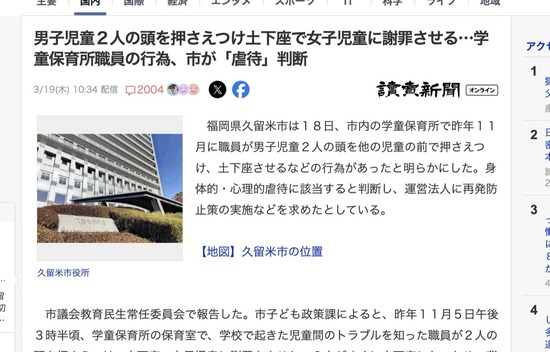 【虐待】学童保育所職員、男子児童の頭を押さえつけて無理やり女子に土下座させる