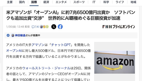 【朗報】Amazon、OpenAIに8兆円弱の投資を発表してしまう