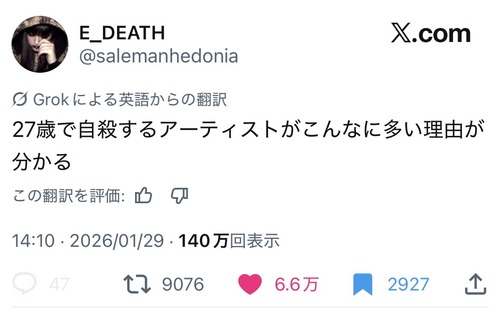 【悲報】X民「27歳で自死するアーティストがこんなに多い理由が分かる」
