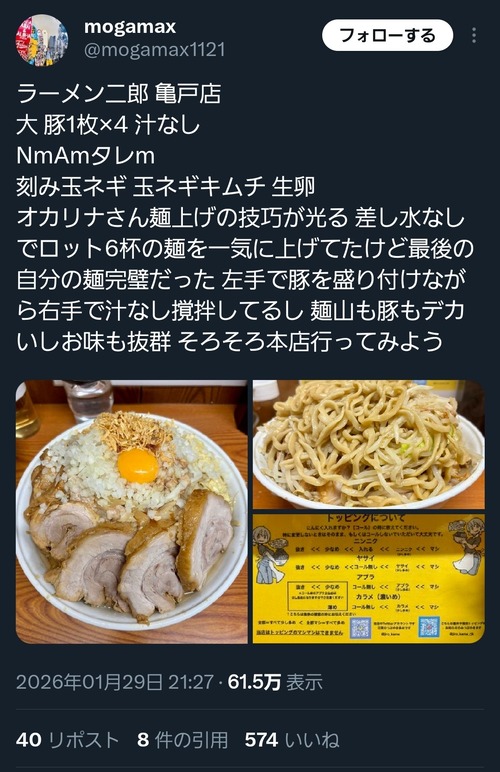 【悲報】ラーメン二郎レビュアーに店主ブチギレ「あだ名付けるのはどうなんでしょう」