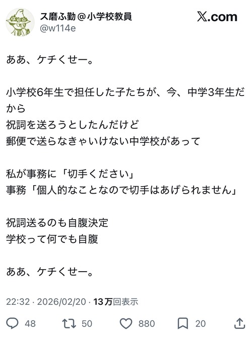 【悲報】小学校教員、学校の対応にブチギレるwwww