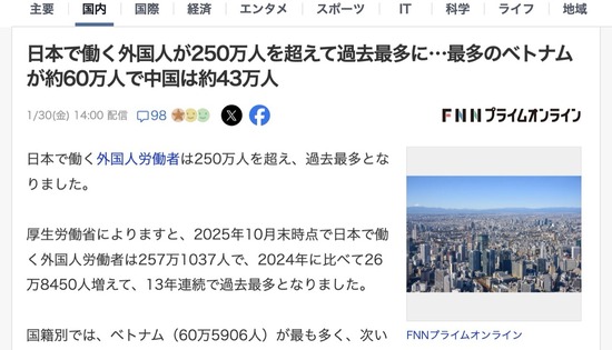 日本で働く外国人が250万人を超えて過去最多に 最多はベトナムが約60万人、中国は約43万人