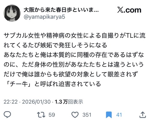 【悲報】アニメアイコン「精神病女性の自撮りを見るたび嫉妬で発狂しそうになる。」