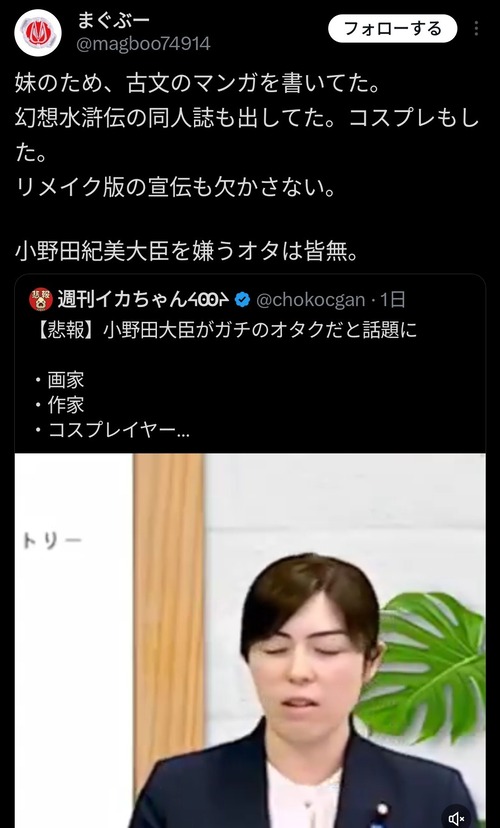 【悲報】オタク「小野田大臣はコスプレも創作もしてたオタクの味方!小野田大臣を嫌うオタクは皆無」