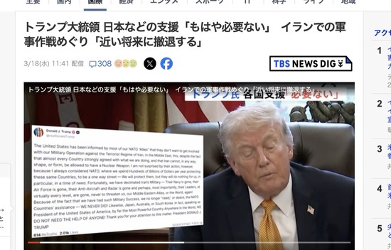 トランプ大統領「ホルムズ海峡への支援要請は、各国が本当に米国の味方なのかを確認するテストだった」