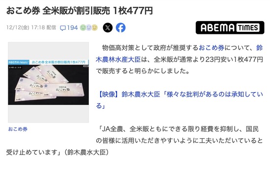 鈴木農水相「440円分の買い物ができる500円のお米券を、今回だけ特別に477円で販売します!」